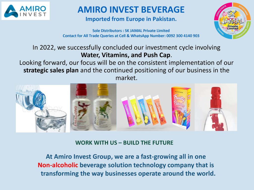 We are Looking Distributors for our Quality Products imported from Slovenia in Pakistan, Uzbekistan, Kyrgyzstan, Kazakhstan, Tajikistan, Afghanistan. Our partner manufacturing company is duly organized and existing under the laws of Slovenia, EU with its principal place of business at Maribor, Slovenia, EU, Manufacturing FDA - GMP Approved Products to Supply worldwide AmiOriginal CBD 2023 AmPharma program 2023 Vit beverage 2023 CBD and THCF program 2023 Amiro Drinking Watervitamin Ami Nuts 2023 Clever solution in private labelling Make your own vitamins and supplements product in Push Caps or in Pouches GASTRO CARE Your dietary companion to a balanced digestion. GastroCare drink is a drink for relieving stomach pain and regulating digestion. IMUNO CARE ImunoCare drink is a drink to strengthen the immune system. STRESS CARE Your dietary companion to stress management. Stress management supplementation with magnesium citrate to modulate serotonin and cortisol levels related to stress and a complex of B vitamins for better effectiveness in cognitive tasks. BEAUTY CARE Let your skin breathe youth. Patented fish collagen peptides supplementation with added hyaluronic acid, MSM, vitamin C, biotin and zinc to stimulate natural collagen production ACTIVE CARE ActiveCare drink is a drink with the addition of fructose for a vital day without chronic fatigue and anemia. CBD and THC Flavored powder CBD + Vitamins, CBD+THC+Vitamins or THC + Vitamins SLIM LIQUID ENHANCER Revolutionary SLIM formula For extremely efficient weight control, slimming, reduction of cholesterol and detoxification. SPORTS VITAMIN DRINK Vitamin enhancer in different flavors: ORANGE, LEMON, RED ORANGE, LIME, ELDER & LEMON, ORANGE LIGHT.