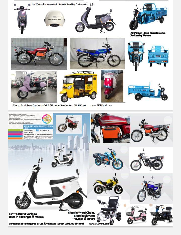 Electric Bikes (Full Range, Electric Motorcycles, Electric Heavy Bikes), Scotties, Electric Vehicles, Electric Cars, Electric Vans, Electric Buses, Electric Wheel Chairs, Electric  Desert Vehicles, Electric Rickshaws, Electric Loaders, Electric Transportation Vehicles for local market & Farmers (From Lands to Market).